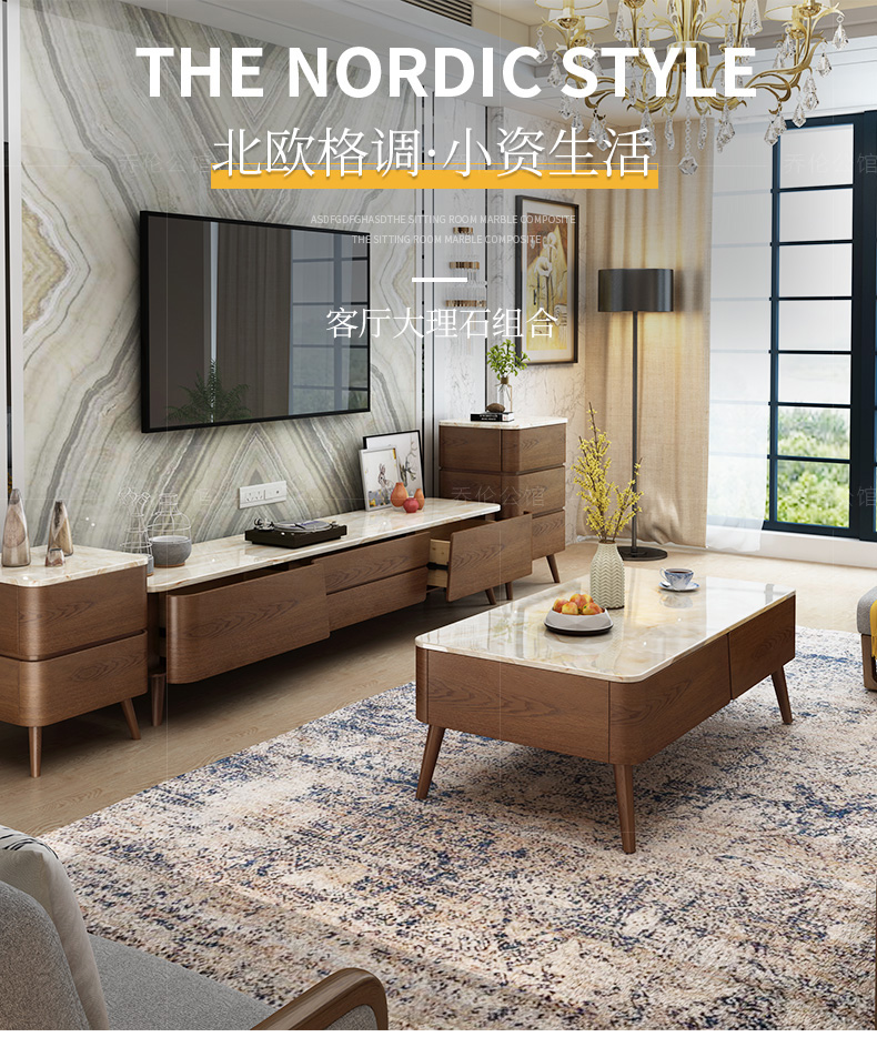 喬倫公館茶何北欧大理石テレビキャビネット茶の組み合わせ辺のキャビネット現代簡単で小さい戸間型客間胡桃色テレビキャビネットの色の備考(オーダーメイドはカスタマーサービスに相談してください)の全セットの組合せ(茶何+テレビキャビネット+2斗の箱+3斗のキャビネット)